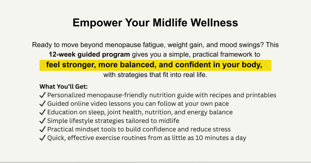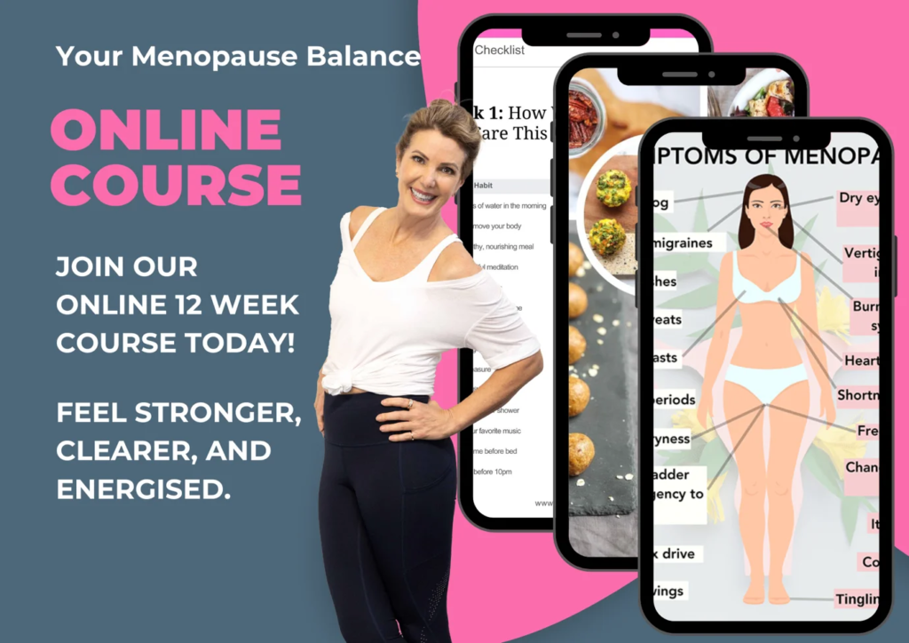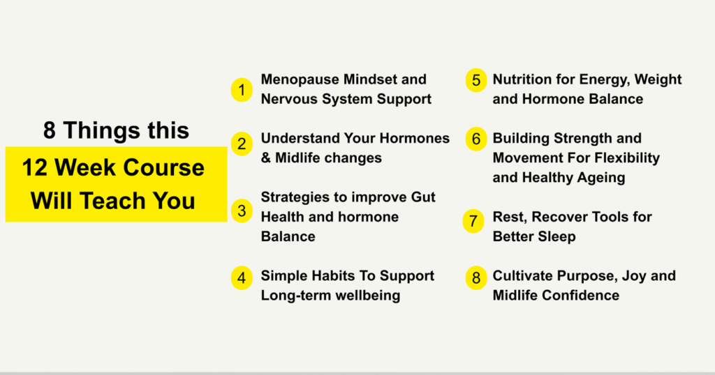 This 12-week lifestyle program gives you practical tools in nutrition, movement, mindset, and daily rhythms to help you work with your changing hormones and feel strong, steady, and back in control.