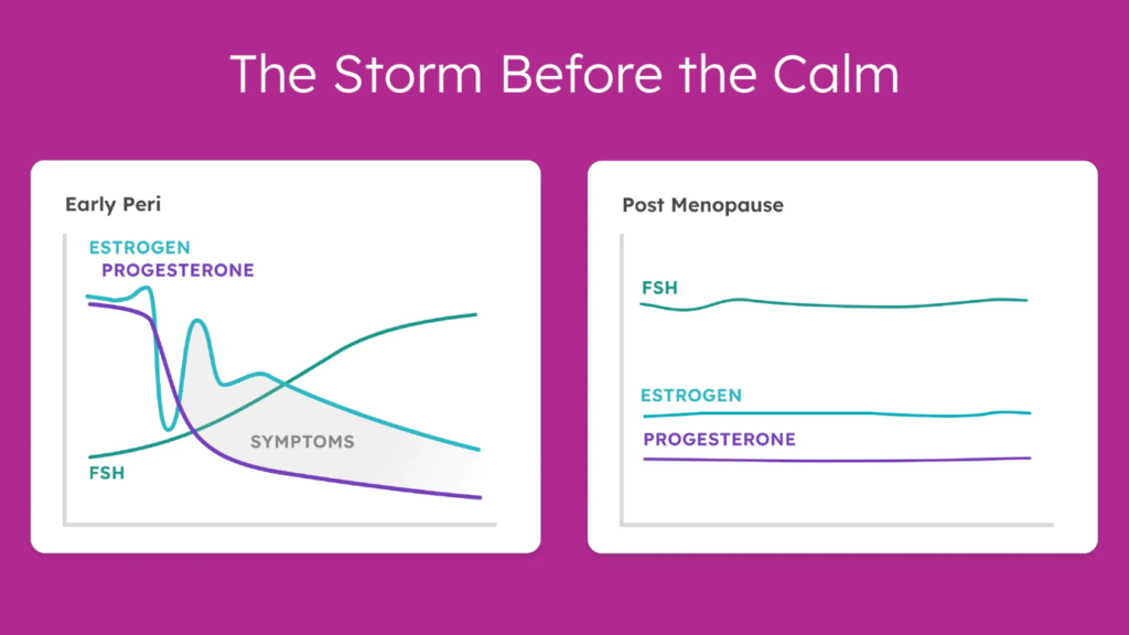 Oestrogen and progesterone don’t simply decline — they rise and fall unpredictably. One month you may feel fine. The next, completely different.